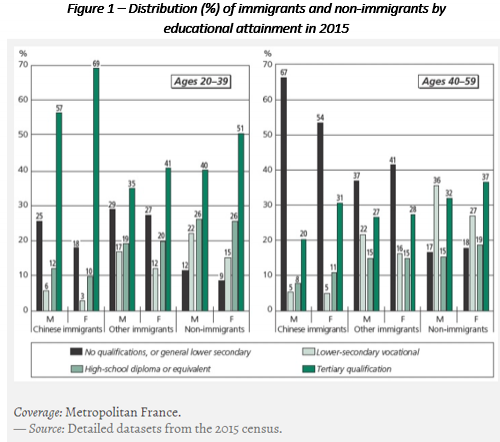On average, Chinese immigrants throughout the world have higher educational attainment than both immigrants from other foreign countries and natives in receiving countries. While in the United States and Canada this is due in part to selective migration policies, a similar phenomenon is observed in France, where the proportion of adults aged 20 to 59 with a higher education degree is greater among Chinese immigrants (50%) than other immigrants (32%) and native French (40%). The overrepresentation of Chinese migrants in this educational attainment category is due to the aforementioned fact that students represent a high proportion of total Chinese migration to France (Figure 1).