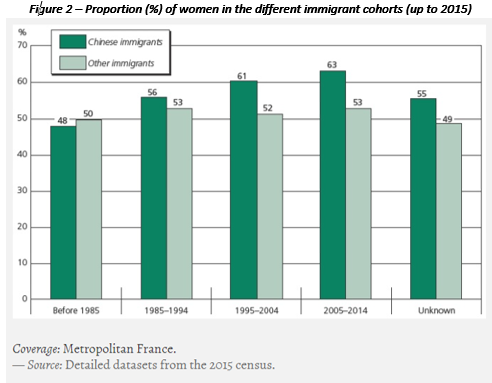 Chinese immigrants are also distinguished by an overrepresentation of women (60% in 2017, as against 51% of immigrants from other countries: Figure 2). This is due to increasingly feminized entry flows of Chinese nationals: the proportion of women admitted for residence in France rose from 56% in 1999 to 62% in 2017.