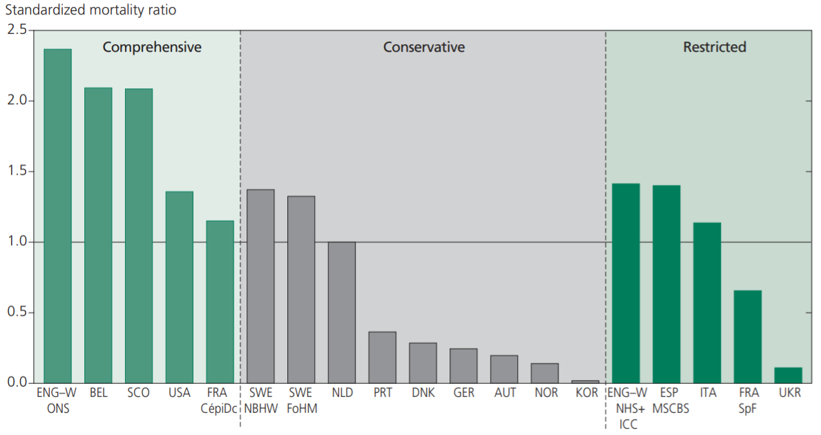 Reading: Comparative mortality indices compare the number of deaths found for a given population with the number that would have been obtained if the norm used was age- and sex-specific mortality rates (established using a reference population). Here the reference is the Netherlands. A CMI of 1.0 indicates that the death figures found for a given country are the equivalent of those observed in the Netherlands. A CMI below 1.0 indicates that COVID-19 mortality is not as high as expected; conversely, a CMI above 1.0 indicates that it is higher than expected. The highest indices were generally found in countries that use comprehensive data sources; the lowest in countries using restricted sources.