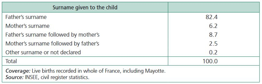 In 2005, a new law on surnames came into force, allowing parents to give their children both their surnames by registering their name choice in the civil register (Mazuy et al., 2015, 2016). Of the children born in 2017, slightly over 11% were given both parents’ names. Although this minority choice seems egalitarian because it highlights the child’s dual parentage, it still bears the mark of traditional custom since the father’s surname is put first in eight cases out of ten. This has scarcely changed since 2010.