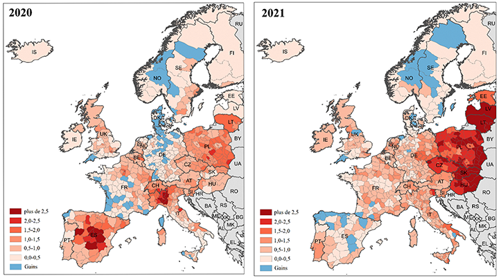 In 2021, excess mortality moved east. It was in regions of Poland, Czechia, Hungary, and Slovakia where the number of years of life lost was highest, at over two years; equivalent losses were found in only one region in Italy and one in Spain, countries that had been hit very hard in 2020. In Germany, a marked contrast is observed between the strongly impacted east and the much less impacted west. In France, the values were more homogeneous in 2021 than 2020, with overall life expectancy losses at close to one year. As in 2020, excess mortality in France in 2021 was highest in the department of Seine-Saint-Denis, immediately north of Paris.