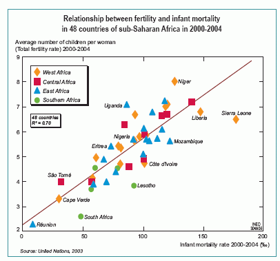 This graph shows the relationship between two demographic indicators: fertility and infant mortality. The values along the horizontal axis indicate the level of infant mortality in each country of sub-Saharan Africa over the period 2000-2004, i.e. the proportion of infants who die before their first birthday (for 1,000 births).