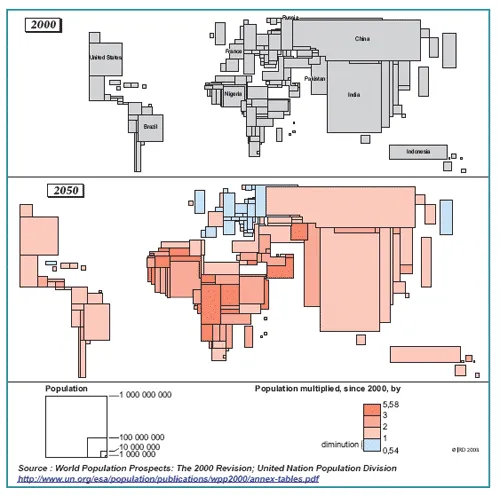 On these two world maps, the countries are represented by rectangles whose surface area is proportional to their estimated population in 2000 (top) and their projected population in 2050 (bottom). Both these population cartograms are constructed on the same scale, so the population change between the two dates can be compared. For the entire world, it rises from 6 billion in 2000 to 9.3 billion in 2050. On the 2050 map, the countries whose population declines between 2000 and 2050 are shown in blue. Countries where the population rises are shown in red: lightred when it increases without doubling, bright red when it is multiplied by two to three, dark red when it more than triples.