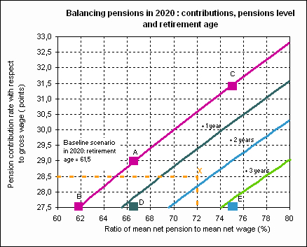 Point A represents the French Pensions Advisory Council's baseline scenario which is based on the new rules laid down in 2003, on current demographic trends and on specific economic assumptions. To achieve equilibrium in 2020, it provides for an increase in retirement age, a reduction of the pension/wages ratio to 67% and a 1.5 point increase in contribution rates. The line BC gives the range of possible combinations of contributions increases and reductions in the pension/wage ratio if retirement age is not increased any further.