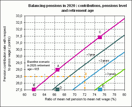 All points on this graph represent a balanced situation in 2020. We are free to choose two criteria, and the third is imposed by these first two choices. For example, the point of equilibrium X corresponds to a contribution rate of 28.5% (one point higher than the rate in 2003) and a pension level correponding to 72% of wages (three points below the ratio of 2003). To achieve equilibrium, age at retirement must be raised by 1.75 years with respect to the baseline scenario, which is already calculated for a retirement age higher (61.5 years old in 2020) than that of 2003 (60.9).