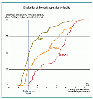 The horizontal line at 50% separates the world population into two groups of equal size and shows the median fertility level. In around 1950, median fertility was 5.4 children per woman, while in 2003 it had fallen to just 2.1 children per woman.The vertical line corresponds to 2.1 children per woman. This is the replacement level required to ensure that the population remains constant as each set of parents is replaced by its offspring. The proportion of the world population living in a country with below-replacement fertility increased from 1% in 1950-55 to 25% in 1975-80 and 50% in 2003.
