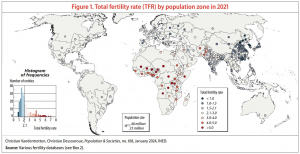 The geography of fertility has changed radically over the last 20 years. The world fertility map illustrates the major fertility decline across the world, including in Africa, over the last 2 decades. In 2021, almost two-thirds of the world population lived in zones where fertility is now below replacement level. The lowest levels are observed in Chinese coastal megacities, Manchuria, and South Korea, where the TFR is below one child per woman. The low-fertility category, which already included the populations of Europe and eastern Asia in the 2000s, now also encompasses almost all the Americas, a large part of India, Indonesia and, recently, the Philippines.