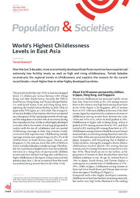 In recent decades, most economically developed East Asian countries have experienced extremely low fertility levels as well as high and rising childlessness. In Japan, Hong Kong, and Singapore, about 3 out of 10 women born in the mid-1970s remain permanently childless.