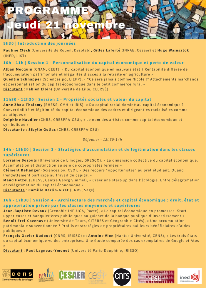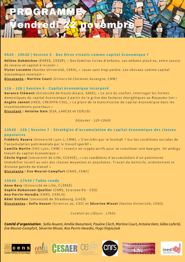 Ces journées d'études invitent à explorer, de la même manière, le capital économique, sans le réduire à son seul volume ou à sa structure, mais en le réinscrivant dans la variété des dimensions de l’activité sociale, en investiguant les différentes formes possibles de son accumulation, de sa valorisation, de sa mobilisation ou de sa reproduction (Bessière, Gollac, 2020), et en prêtant attention aux transformations éventuelles des modes de domination économique, ainsi qu’aux échelles pertinentes pour les saisir (Wagner, 2011). L'objectif est ainsi de nourrir la sociologie des classes sociales à partir d’un usage plus réflexif de la notion de capital économique.