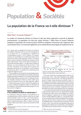 The population of France reached 68.6 million on 1 January 2025. It is still growing, but will it continue to do so? In this latest issue of Population & Societies, Gilles Pison (National Museum of Natural History and INED) and Laurent Toulemon (INED) project population trends up to 2070. Natural increase – the difference between births and deaths – is falling and will become negative in 2027; net migration is now the main driver of population growth. Until when will this dynamic offset the decline in births?