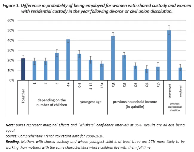 Compared with mother’s residential custody, where children live full time with her, shared physical custody has considerable positive effects on mothers’ employment in the year following divorce or civil union dissolution: the employment rate of mothers with shared custody is 20 points above that for mothers whose children live with them full time. Figure 1, based on French income tax return data, shows that previously non-working women and women in relatively poor households are more likely to be working than not when their children are in shared custody. This holds for separated mothers with one young child and mothers with three or more children as well.