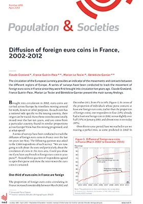 Since they were brought into circulation in 2002, euro coins have travelled widely across Europe. The country of issue gives an indirect indication of the movements of the individuals who have carried these coins and of the intensity of international relations. The percentage of foreign euro coins in France rose from 5% in March 2002 to 34% inDecember 2011, and the proportion is greater for coins with a higher face value (50 cents, 1 or 2 euro), which are more mobile. Distance from the national border is a key factor explaining the domination of Spanish coins in the south-west and of German and Belgian coins in the north-east. Alongside crossborder movements, travel between cities for work purposes and movements of tourists also contribute to the mixing process, as shown by the more diffuse spread of Italian coins across France.