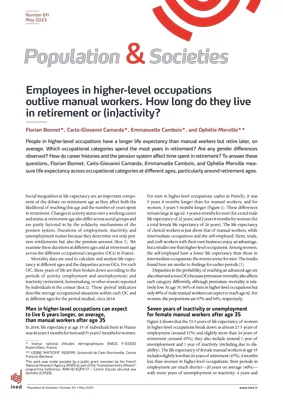People in higher-level occupations have a longer life expectancy than manual workers but retire later, on average. Which occupational categories spend the most years in retirement? Are any gender differences observed? How do career histories and the pension system affect time spent in retirement? To answer these questions, Florian Bonnet, Carlo-Giovanni Camarda, Emmanuelle Cambois, and Ophélie Merville measure life expectancy across occupational categories at different ages, particularly around retirement ages.1
