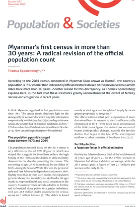 According to official statistics, Myanmar had a population of 61 million in 2012. These figures were obtained using population projections based on the most recent census conducted in 1983. A new population census conducted in Myanmar in April 2014 shed light on the extent of recent demographic changes in the country. Confirming the distinctive childbearing behaviour of Myanmar women and the scale of international migration, these new census data reveal that the population is 15% smaller than indicated by earlier official estimates.
