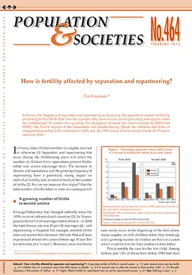 Separation and repartnering are becoming increasingly frequent in France, reflecting a change in conjugal behaviour which is also affecting fertility. While almost all children are born to couples, married or otherwise, a growing proportion are born in second unions. Among men and women born before 1950, 1.4% and 0.7%, respectively, had their first child in a second union, compared with 14% of men and 9% of women in the 1960-1969 cohorts. For both men and women in a second union, the probability of having another child at age 35 is 2.5 times higher than for those in an intact first union. But men who form a new union are more likely to have a child than women of the same age who repartner, as they tend to form couples with younger women. Last, individuals who have experienced two or more unions are more likely to be childless or to have 4 or 5 children than those in intact first unions.