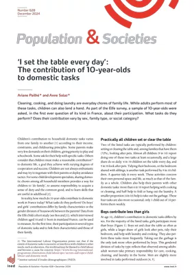 Cleaning, cooking, and doing laundry are everyday chores of family life. While adults perform most of these tasks, children can also lend a hand. As part of the Elfe survey, a sample of 10-year-olds were asked, in the first ever question of its kind in France, about their participation. What tasks do they perform? Does their contribution vary by sex, family type, or social category?