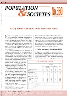 Nearly 1 in every 100 deliveries is a twin birth. Triplet, quadruplet and higher order deliveries occur much more seldom — only once in 10,000 deliveries. Is the incidence of twin births the same everywhere in the world? Do twins grow up like other children? Do they have the same life expectancy? (1) In 1999, out of 2.8 million twins born worldwide, nearly 1.1 million (41%) were born in Africa; 39% were born in Asia, 13% in America, 6% in Europe and 0.5% in Oceania.