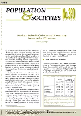 The outputs of the April 2001 Northern Ireland census were eagerly awaited by Unionists, who want to stay within the United Kingdom, and Nationalists, seeking reunification with Ireland. Both were keen to discover how their respective population totals measured up at this, as at every previous, ten-year census, and hence the current demographic load of the two communities—Protestant and Catholic. The mood was particularly tense as the long-standing conflict which has riven the province, with its accompanying political violence and party divisions, had heated up throughout 2002.