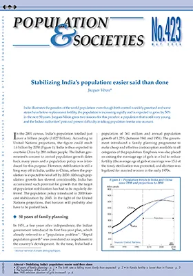 India illustrates the paradox of the world population: even though birth control is widely practised and some tates have below-replacement fertility, the population is increasing rapidly and is expected to grow by 50% in the next 50 years. Jacques Véron gives two reasons for this paradox: a population that is still very young,and the Indian authorities' past and present difficulty in taking population inertia into account.