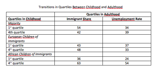 The respective neighborhood compositions of the groups studied partially overlap with the neighborhood compositions experienced by the preceding generation. While socioeconomic determinants do impact intergenerational mobility, the characteristics of the city individuals grew up is much more decisive for whether or not they remain in that neighborhood or move out.