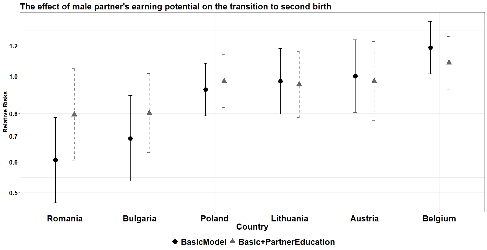Note: All models include duration splines, age at first birth, cohorts, father’s and mother’s education, number of siblings.