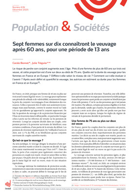 Près d’une femme de plus de 60 ans sur trois est veuve en France. C’est une sur deux au-delà de 75 ans. Dans une nouvelle publication de Population & Sociétés (n° 639), Carole Bonnet (Ined) et Julie Tréguier (DIW Berlin) analysent pour la première fois la durée de cette période de vie souvent marquée par la solitude et un risque de vulnérabilité économique. Leurs travaux révèlent que 70 % des femmes en couple à 60 ans connaîtront le veuvage, pour une durée moyenne de 13 ans. Cette période représente près de la moitié du temps qu’il leur reste à vivre, avec des disparités importantes selon le niveau de vie.
