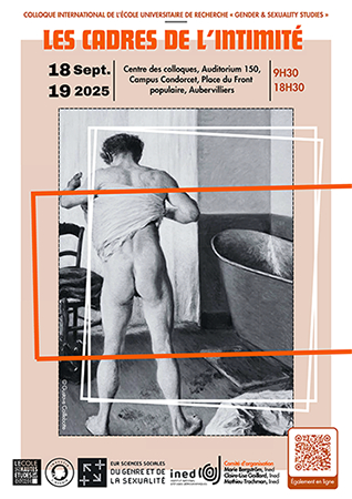 Les cadres de l’intimité Séminaires et colloques du 18/09/2025 au 19/09/2025 Centre des colloques du Campus Condorcet, auditorium 150, de 9h30 à 18h30 Organisé par L’EUR Gender and Sexuality Studies (GSST, Ehess-Ined) Pour suivre le colloque à distancehttps://ined-fr.zoom.us/j/92671553731?pwd=yRoKD7utFYEtdDkan0eU9INPvtKn5Y.1Programme synthétiqueCadrage des parentalitésIntimité et institutions disciplinaires"L'amour tel qu'il est ou tel qu'il se fait ?" Conférence de L. PekerFrontières et continuum d'intimités relationnellesTravailler l'intimitéSororité et intimités entre femmesIntimités hors cadreZoom sur l'image Programme détaillé