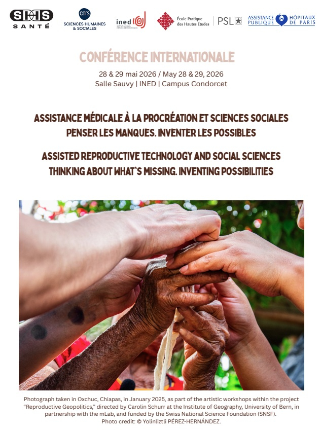 Colloque international "Assistance médicale à la procréation et sciences sociales" Séminaires et colloques du 28/05/2026 au 29/05/2026 A partir de 9h, Ined (salle Sauvy) Ce colloque clôture le projet "Parcours médical et infertilité : Accompagner la fin du parcours procréatif (PARCOURS), financé par la Plateforme SHS-Santé".Zoom sur l'image Partager & Imprimer Programme et site officiel du colloque