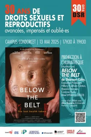 Projection du film "Below the belt" 30 ans de droits sexuels et reproductifs Séminaires et colloques 25/06/2025 de 17h30 à 19h30 Humathèque du Campus Condorcet Tout au long de l’année 2025, un cycle de conférences et de projections est organisé dans le cadre des 30 ans de la Conférence Internationale sur la Population et le Développement du Caire (CIPD, 1994) et de la Conférence Mondiale de la Femme de Beijing (1995), deux événements majeurs pour la reconnaissance des droits sexuels et reproductifs.Une projection du film "Below the belt" de Shannon Cohn, sera organisée le 13 mai de 17h30 à 19h30 à l’Humathèque du Campus Condorcet de 17h30 à 19h30. Le sujet du film est l’endométriose.DiscutanteAlice Romerio (Université Paris 8)Zoom sur l'image Links for more infoMore information on this eventprogramme.cycle_.conferences.droits.sexuels.reproductifs.fr_.pdf