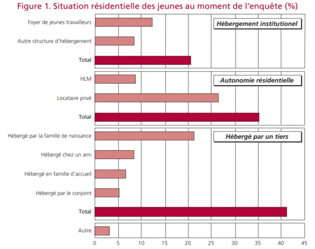 Trois situations résidentielles se dégagent à la sortie de l’ASE : environ 20% des jeunes sortis de l’ASE rejoignent un hébergement institutionnel, le double trouve à se faire héberger, tandis qu’un peu plus du tiers accèdent à un logement autonome (Figure 1). Dans la période qui suit le départ de l’ASE, les enquêtés cumulent les désavantages sur le marché immobilier : ils sont jeunes et disposent de peu de ressources (28 % sont chômeurs, 6 % inactifs et ceux qui travaillent occupent des emplois précaires et peu qualifiés). De surcroît, ils ne peuvent pas compter sur l’appui de la famille pour les aider financièrement ou se porter garant auprès d’un bailleur. Leurs chances de se loger sur le marché privé locatif sont donc réduites, sauf pour ceux qui accèdent à un CDI et vivent dans des zones où les prix du logement ne sont pas trop élevés.