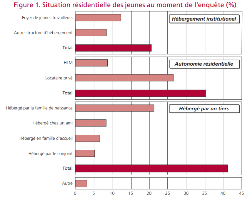 Les jeunes de l’ASE sont majoritairement issus des catégories populaires précarisées. Durant leur enfance, ils ont souvent été confrontés à des difficultés de logement avec leur famille, celles-ci étant très répandues chez les ménages aux faibles ressources. La prise en charge par l’ASE les expose, en outre, à un « ballotage » de structure en structure. Au moment de la première vague de l’enquête, près de la moitié des jeunes placés (âgés de 17 à 20 ans) était passé par au moins trois lieux de placement : 22% en avaient déjà connu trois, 9 % quatre et 17 % cinq et plus. Plus du tiers déclaraient qu’il leur était arrivé de devoir quitter un lieu d’accueil où ils auraient souhaité rester, une situation vécue comme un déplacement contraint. Même s’il existe des parcours plus stables (la moitié des jeunes a connu un ou deux lieux de placement), une part importante des enquêtés a donc été confrontée à une expulsion chronique, c’est-à-dire des déménagements forcés à répétition. Surtout, le moment de la transition vers la sortie de placement les met une nouvelle fois face à cette problématique : tous savent qu’ils vont être contraints de quitter leur lieu de vie.