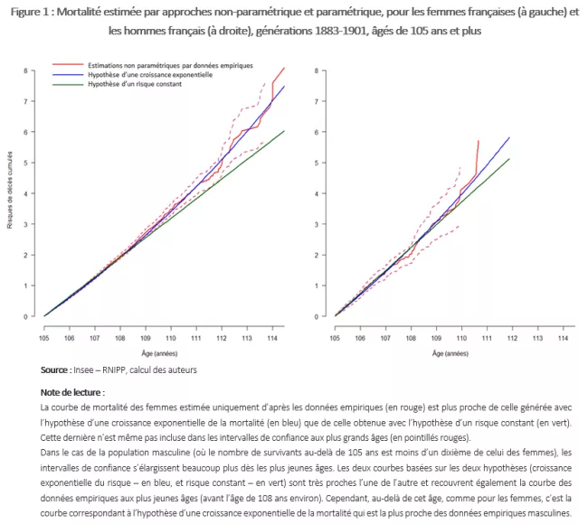 En 2016, des généticiens avaient publié un article dans Nature suggérant que la longévité humaine était limitée à 115 ans environ (Dong et al., 2016). Deux ans plus tard, en 2018, des démographes utilisant des données italiennes suggéraient au contraire dans Science qu’il n’y avait pas de limites formelles à la longévité (Barbi et al. 2018). Ils constataient des taux de mortalité essentiellement constants au-delà de 105 ans et soutenaient donc l’existence d’un « plateau de mortalité » à partir de cet âge chez les humains (figure 1). L’existence de ce plateau signifierait que, passés 105 ans, les taux de mortalité cessent de dépendre de l’âge et restent les mêmes quel que soit l’âge. Cela impliquerait qu’il n’y a pas de limites strictes à la longévité humaine, les valeurs les plus élevées observées ne dépendant que du nombre des personnes atteignant l’âge de ce plateau.
