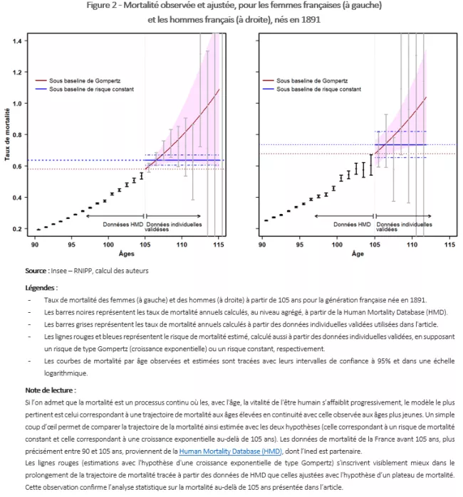 La nouvelle étude publiée dans Demographic Research utilise les données riches et exceptionnellement fiables issues d’IDL (voir encadré) pour répliquer l’étude italienne de 2018 sur la population française. Celle-ci ne confirme pas les résultats italiens mais suggère au contraire une augmentation des taux de mortalité au-delà de 105 ans, sans aucun indice en faveur d’un plateau de mortalité. Les auteurs confirment un désavantage significatif pour les hommes en termes de mortalité, mais ne mettent en évidence aucun effet de l’année de naissance sur les résultats (figure 2). Ils invitent donc à poursuivre la collecte de données pour des études ultérieures et à se garder de toute conclusion hâtive sur la mortalité aux âges extrêmes.