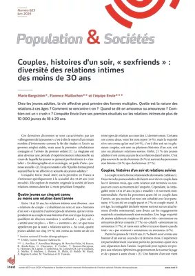 Quatre jeunes adultes (18-29 ans) sur cinq ont connu au moins une relation amoureuse ou sexuelle dans l’année. Une majorité dit avoir été en couple (66 %), mais il est également fréquent d’avoir connu une histoire d’un soir (21 %) ou encore des relations suivies qualifiées par les jeunes de différentes manières (15 %). Les lieux d’études et de travail restent un espace de rencontre des couples tandis que les lieux publics et les applications de rencontre sont plus propices aux histoires d’un soir. Être en couple diffère peu selon l’origine sociale des parents mais les autres relations sont plus fréquentes pour les jeunes de milieu favorisé, en particulier les femmes.