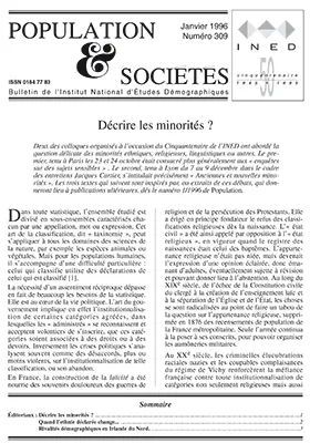 Deux des colloques organisés à l'occasion du Cinquantenaire de l'INED ont abordé la question délicate des minorités ethniques, religieuses, linguistiques ou autres. Le premier, tenu à Paris les 23 et 24 octobre était consacré plus généralement aux « enquêtes sur des sujets sensibles » . Le second, tenu à Lyon du 7 au 9 décembre dans le cadre des entretiens Jacques Cartier, s'intitulait précisément « Anciennes et nouvelles minorités ». Les trois textes qui suivent sont inspirés par, ou extraits de ces débats, qui donneront lieu à publications ultérieures. dés le numéro 1/1996 de Population.