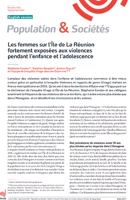 À La Réunion, d’après l’enquête Virage dans les Outre-mer, 30 % des femmes et 25 % des hommes déclarent des faits de violence avant 18 ans dans les différentes sphères de vie (études, loisirs, cercle amical, famille, proches). Ces faits sont nettement plus fréquents que dans l’Hexagone. Au sein de la famille, les femmes déclarent davantage de violences subies, et cela de tout type (psychologique, physique, sexuel). Les auteurs de violences sexuelles subies par les mineures de moins de 18 ans sont majoritairement des hommes de la famille et de l’entourage proche.