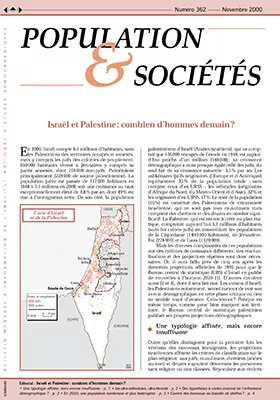En 2000, Israël compte 6,1 millions d'habitants, sans les Palestiniens des territoires occupés et annexés, mais y compris les juifs des colonies de peuplement. 650 000 habitants vivent à Jérusalem y compris sa partie annexée, dont 210 000 non-juifs, Palestiniens principalement (228 000 de source palestinienne). La population juive est passée de 717 000 habitants en 1948 à 5,1 millions en 2000, soit une croissance au taux exceptionnellement élevé de 3,8 % par an, dont 49 % est due à l'immigration nette. De son côté, la population palestinienne d'Israël (Arabes israéliens), qui ne comptait que 156 000 rescapés de l'exode en 1948, est aujourd'hui proche d'un million (948 000) ; sa croissance démographique a ainsi presque égalé celle des juifs, du seul fait de sa croissance naturelle : 3,5 % par an. Les ashkénazes (juifs originaires d'Europe et d'Amérique) représentent 35 % de la population totale - sans compter ceux d'ex-URSS -, les séfarades (originaires d'Afrique du Nord, du Moyen-Orient et d'Asie), 32 % et les originaires d'ex-URSS, 17 %. Le reste de la population (16 %) est constitué des Palestiniens de citoyenneté israélienne, qui ne sont pas tous musulmans mais comptent des chrétiens et des druzes en nombre significatif. La Palestine, qui est encore à créer au plan étatique, compterait aujourd'hui 3,2 millions d'habitants (sans les colons juifs) en rassemblant les populations de la Cisjordanie (1 840 000 habitants), de Jérusalem-Est (228 000) et de Gaza (1 120 000).