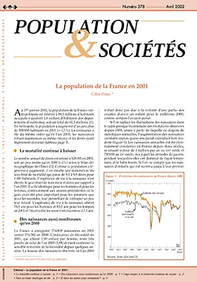 Au 1er janvier 2002, la population de la France métropolitaine est estimée à 59,3 millions d'habitants auxquels s'ajoutent 1,8 million d'habitants des départements d'outre-mer, soit un total de 61,1 millions [1]. En métropole, la population a augmenté d'un peu plus de 300 000 habitants en 2001 (+ 0,5 %). La croissance a été du même ordre qu'en l'an 2000, les naissances s'étant maintenues au même niveau et les décès ayant légèrement diminué (tableau page 2).