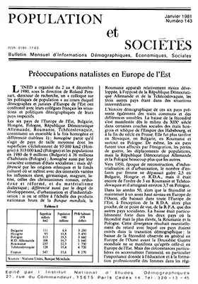 L'INED a organisé, du 2 au 4 décembre 1980, un colloque sur "les politiques de populations" au cours duquel démographes et juristes d'Europe de l'Est ont confronté avec leurs collègues français les situations et politiques démographiques de leurs pays respectifs.