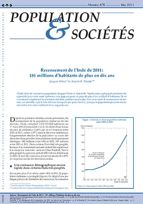 Les premiers résultats du recensement indien de 2011, innovant par son contenu, ses modalités et le mode de traitement des données, indiquent un ralentissement de la croissance démographique depuis 2001 (1,64 % de croissance annuelle moyenne, contre 1,97 % entre 1991 et 2001) et une progression de l'alphabétisation (65 % en 2001 et 74 % en 2011). Mais de nombreuses disparités persistent, notamment en termes de taux de fécondité et de mortalité infantile, ou de densités qui augmentent dans les plaines agricoles, autour du Gange et des mégapoles de Dehli et Kolkota (Calcutta). La discrimination vis-à-vis des petites filles a diminué dans les États où elle était la plus forte mais s'est accentuée ailleurs. Bien que la population indienne soit bien avancée dans sa transition démographique, elle va continuer de croître dans les cinquante prochaines années.