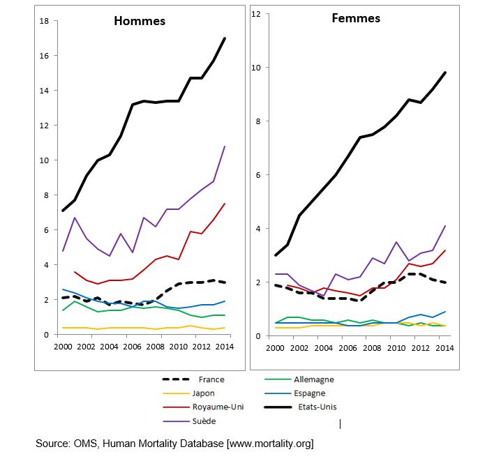 Source : Magali Barbieri, 2018, The contribution of drug-related deaths to the US disadvantage in mortality, International Journal of Epidemiology.