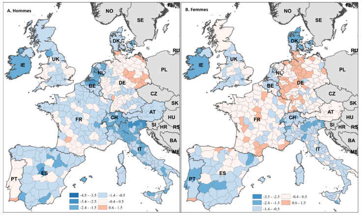 Note : la figure présente la variation annuelle en % de la possibilité de décéder entre 55 et 74 ans dans 450 régions d'Europe occidentale entre 2018 et 2019 séparément pour les hommes (à gauche) et pour les femmes (à droite). cette période correspond à la fin de la fenêtre d'observation de l'étude. Les régions en bleu connaissent une baisse de la mortalité à ces âges, celles en saumon une hausse, et celles en blanc une stabilité. Les probabilités de décès sont estimées à partir de tables de mortalité lissées dans le temps de sorte que es variation observées reflètent des tendances de fond et non des fluctuations conjoncturelles propres à une année donnée.