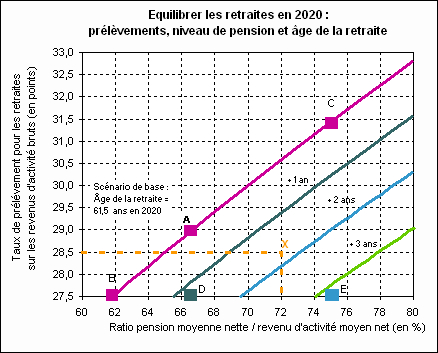 Le point A indique le scénario de base du Conseil d'orientation des retraites fondé sur les nouvelles règles posées en 2003, les évolutions démographiques et des hypothèses économiques spécifiques. Il prévoit, pour atteindre l'équilibre en 2020, une augmentation de l'âge effectif de la retraite jusqu'à 61,5 ans, ainsi qu'une diminution du ratio pensions/salaires à 67 % et une hausse des prélèvements de 1,5 point. Sans modifier davantage l'âge de la retraite, la droite BC résume les arbitrages possibles entre hausse des prélèvements et baisse du ratio pensions/salaires. Une hausse de l'âge de retraite conduit à d'autres scénarios. Une hausse supplémentaire de trois ans est nécessaire pour maintenir inchangés les autres paramètres. Le point E décrit ainsi un ratio pensions/salaires constant à 75 %, un taux de prélèvement constant à 27,5 points et un âge effectif de la retraite de 64,5 ans en 2020 pour maintenir l’équilibre. Toutes les solutions intermédiaires sont possibles (points X ou D par exemple).