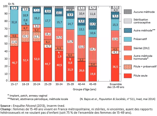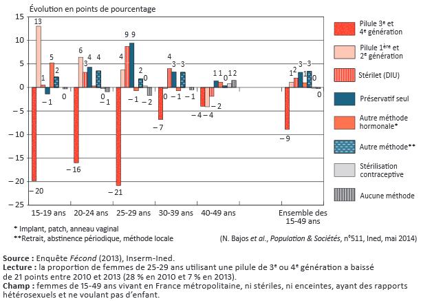 Entre 2010 et 2013, le recours à la contraception orale est passé de 50 % à 41 % chez les femmes de 15-49 ans (parmi celles concernées par la contraception). Ce recul est dû à la baisse des pilules incriminées : leur usage est passé de 19 % à 10 % en trois ans. Mais les femmes ne se sont pas beaucoup reportées vers les pilules de 2e génération (23 % d’utilisatrices contre 22 % en 2010), ce qui suggère une désaffection vis-à-vis de la pilule en général. La baisse est particulièrement marquée chez les jeunes femmes de moins de 30 ans. Les jeunes femmes de 25-29 ans en particulier se sont davantage tournées vers le stérilet ou le préservatif.