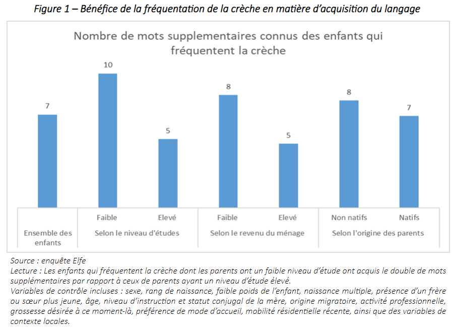 Les enfants les moins favorisés - en particulier ceux dont les mères ont un faible niveau d’étude, sont immigrantes et ceux des ménages à faible revenu - semblent bénéficier le plus de la fréquentation de la crèche, notamment en ce qui concerne le développement du langage (figure 1).