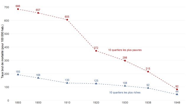 Ces inégalités ont atteint leur paroxysme juste avant la première guerre mondiale, avec une mortalité plus de quatre fois supérieure dans les dix quartiers les plus pauvres que dans les dix quartiers les plus riches. Elles avaient très largement décliné à la fin de la seconde guerre mondiale (figure 4).