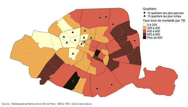 On observe par ailleurs des écarts de mortalité considérables selon les quartiers, reflet des inégalités sociales de l’époque. On lit ainsi une opposition nette entre un Paris aisé du centre-ouest et un Paris populaire des marges orientales, une fracture sociale qui se superpose clairement à la carte de la mortalité par tuberculose (figure 3).