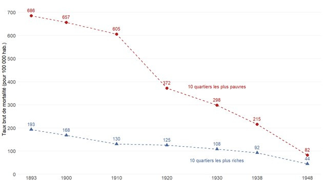 On observe par ailleurs des écarts de mortalité considérables selon les quartiers, reflet des inégalités sociales de l’époque. On lit ainsi une opposition nette entre un Paris aisé du centre-ouest et un Paris populaire des marges orientales, une fracture sociale qui se superpose clairement à la carte de la mortalité par tuberculose (figure 3). Ces inégalités ont atteint leur paroxysme juste avant la première guerre mondiale, avec une mortalité plus de quatre fois supérieure dans les dix quartiers les plus pauvres que dans les dix quartiers les plus riches. Elles avaient très largement décliné à la fin de la seconde guerre mondiale (figure 4).