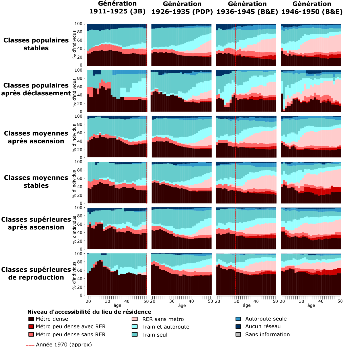 Note : La ligne pointillée verticale désigne approximativement l’année 1970 ; elle est utilisée comme référence pour positionner les trajectoires des différentes générations dans leurs contextes ; l’année 1970 a été choisie car elle correspond aux débuts des politiques d’aménagement urbain à l’échelle de la région et du développement du RER.