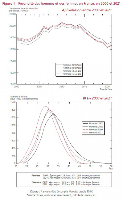 L’article de Conjoncture démographique 2023 de l’Ined a mis l’accent sur les écarts et sur les dynamiques des indicateurs selon le sexe des personnes. Parmi les évolutions observées, celles relatives à la fécondité des hommes comparée à celle des femmes. En 2021, l’âge moyen à la parentalité est de près de trois ans plus élevé chez les hommes, ce qui fait écho à la différence d’âge au moment de la mise en couple. L’indicateur conjoncturel de fécondité des hommes est supérieure à celui des femmes et cela depuis 2010 (1,87 pour les hommes contre 1,84 pour les femmes en 2021), mais la descendance finale des hommes nés en 1961 (1,96) est légèrement inférieure à celle des femmes de la même génération (2,09).